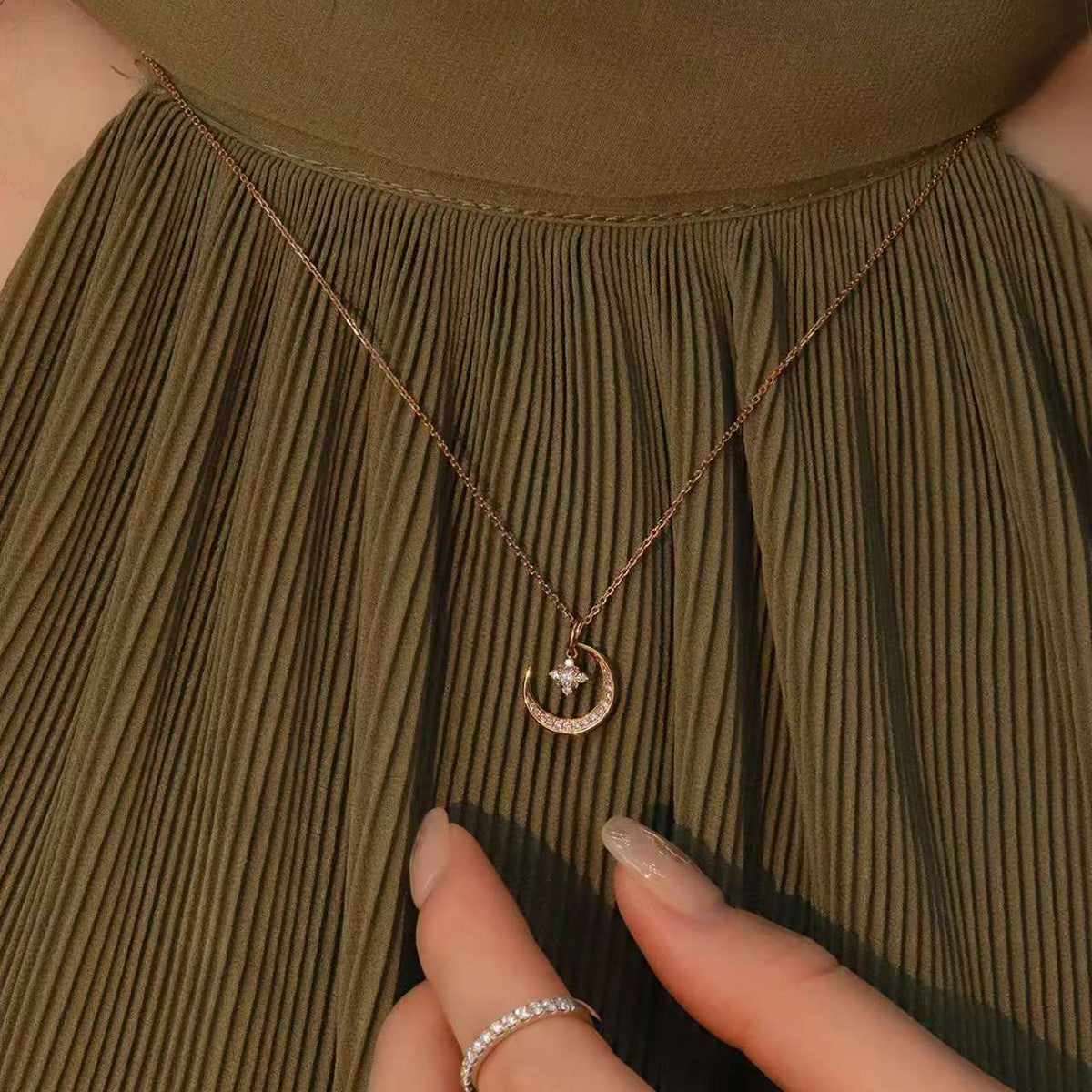 18K Gold Crescent Moon Star Pendant Necklace Lab-Grown Diamond Minimalist Chain Elegant Celestial Jewelry for Women