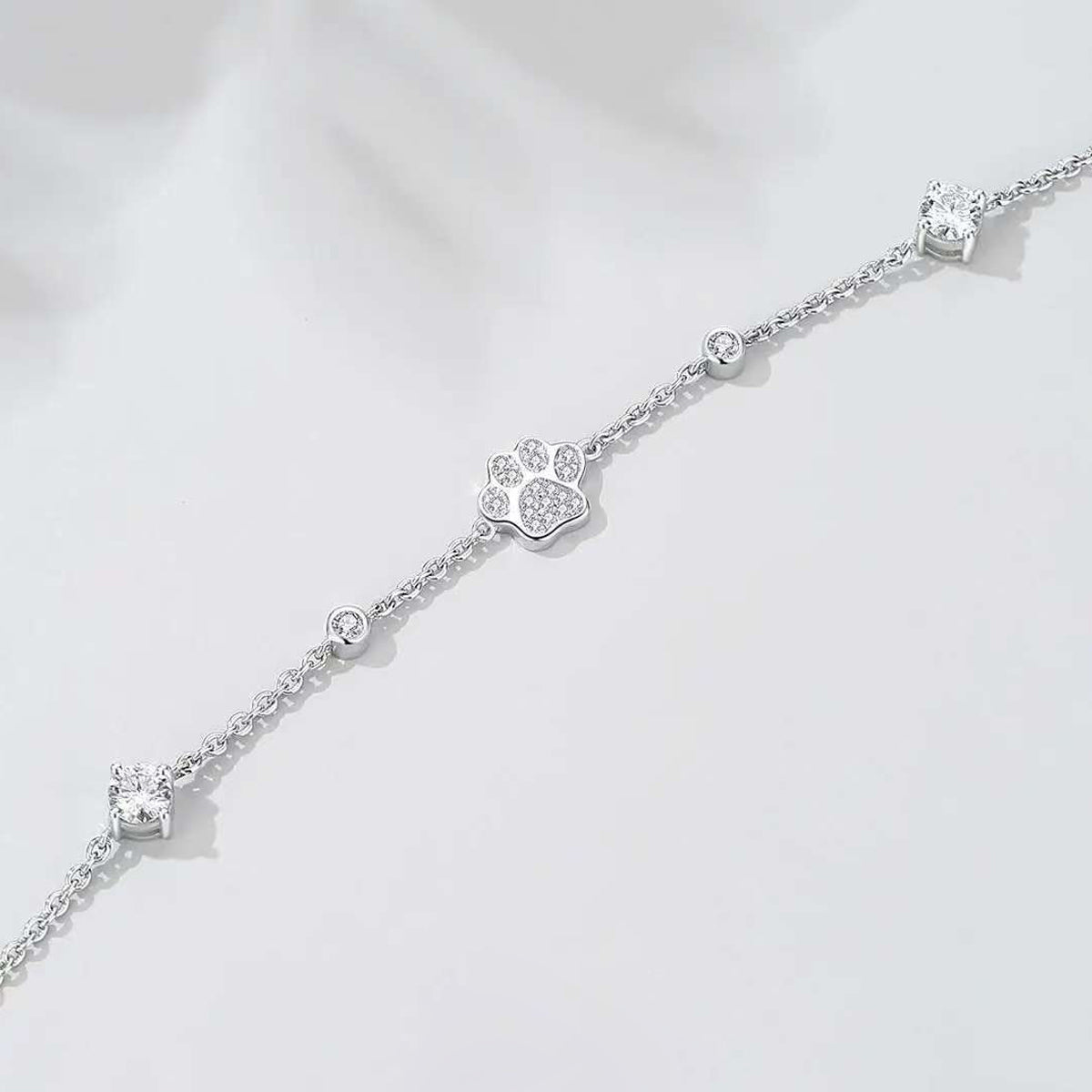 Carry a piece of your furry friend with you, always. This charming sterling silver bracelet captures the heartwarming spirit of your beloved pet, featuring an adorable paw print motif at its center, meticulously adorned with sparkling round-cut diamonds (or high-quality cubic zirconia). Delicate individual stones are interspersed along a fine silver chain, creating a continuous shimmer.